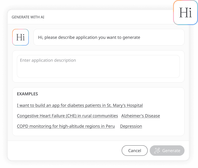 AI-assisted configuration and generation of regulated digital health applications, enabling teams to rapidly assemble patient and clinician workflows on the Huma Cloud Platform.