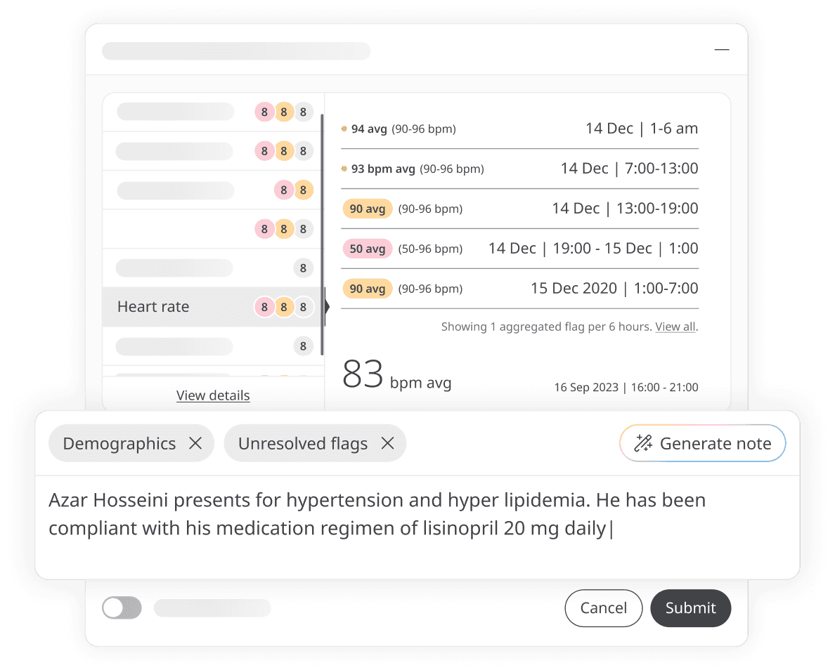 AI-assisted generation of structured clinical notes from patient-reported data and interactions, reducing administrative burden while keeping clinicians in control.