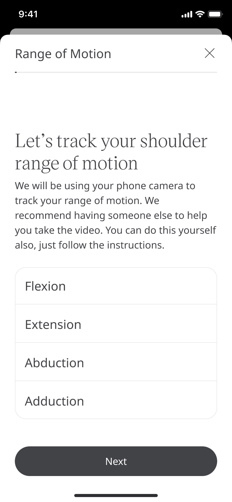Range-of-motion tracking using mobile devices to support rehabilitation, physiotherapy, and post-operative follow-up.