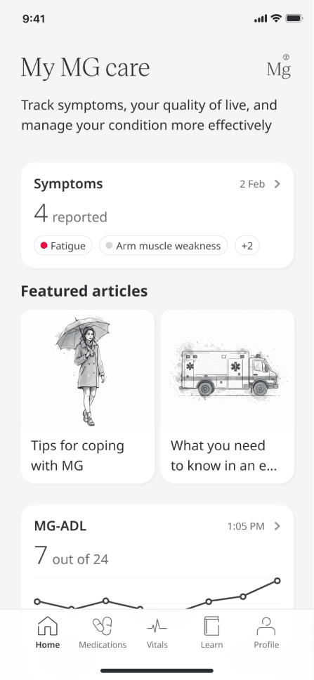 Huma MG empowers patients with tools for symptom tracking, education, and proactive care to improve quality of life and reduce healthcare burdens.
