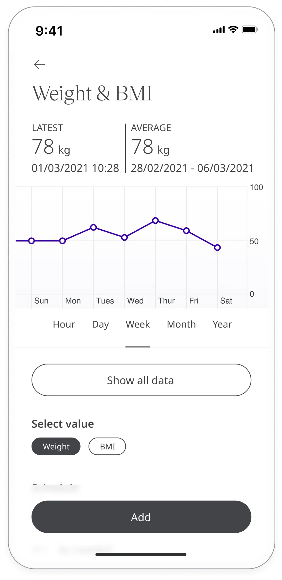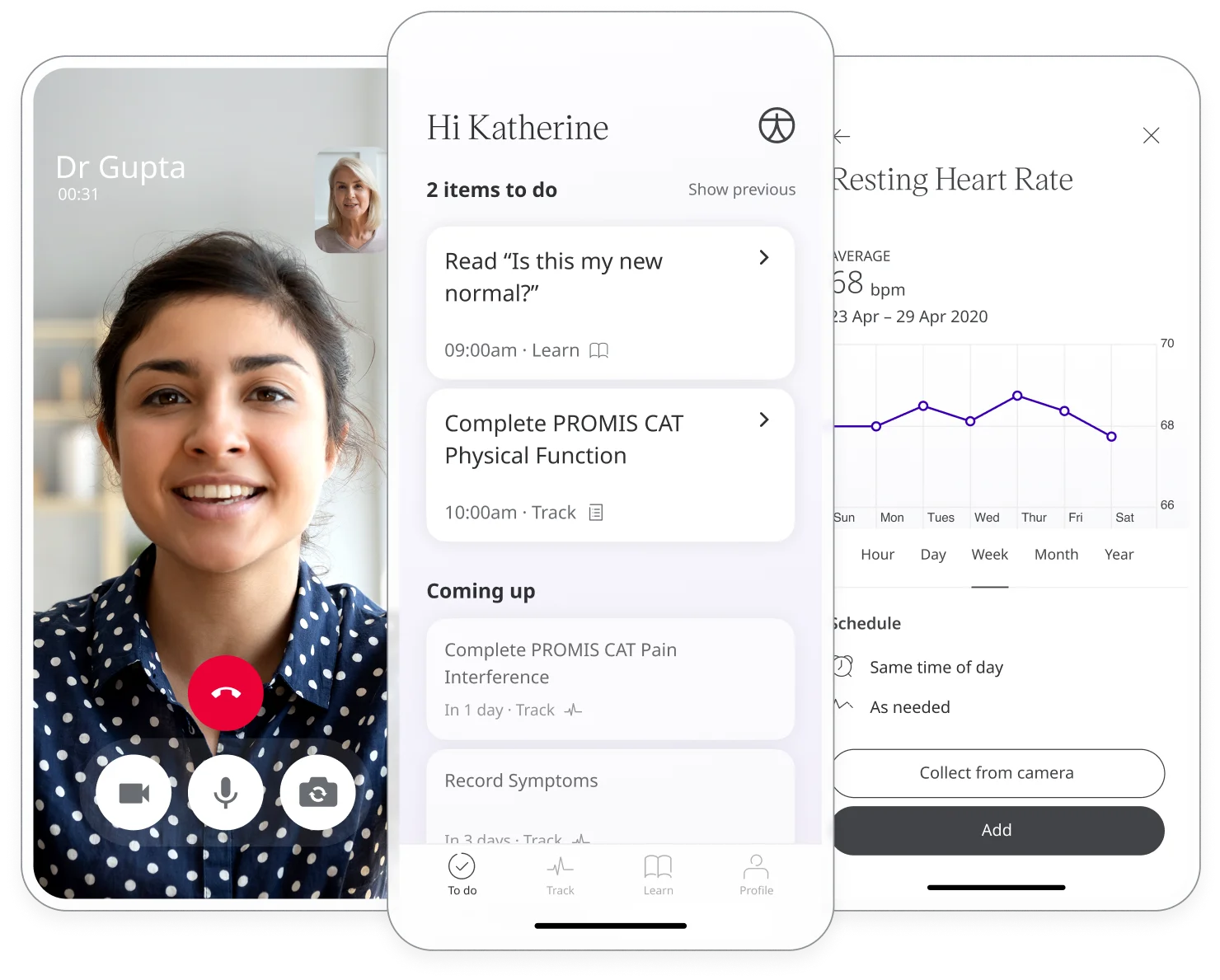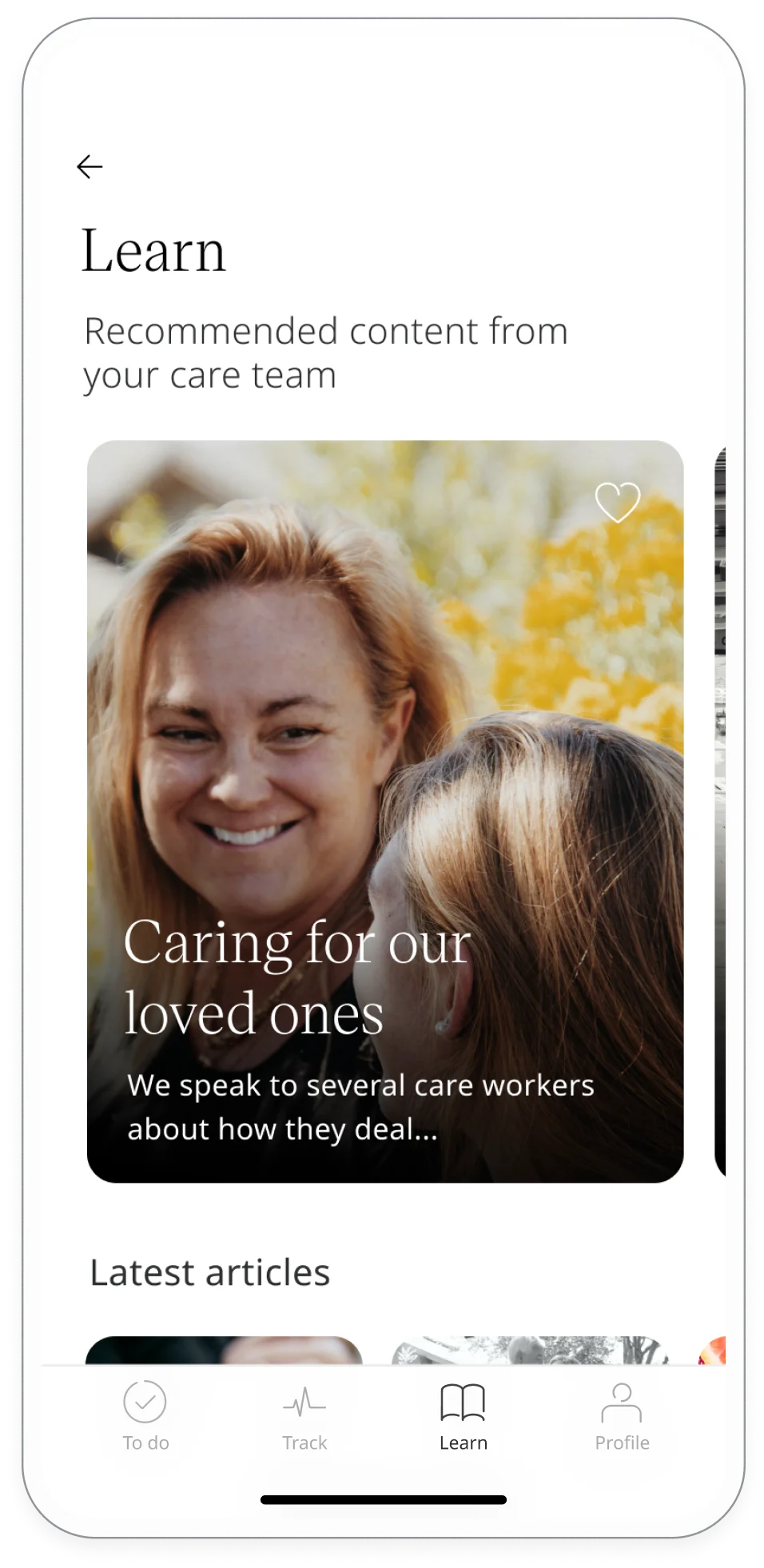 Through our app, patients access a care plan configured for their needs by clinicians using a library of modules and features. Patients can feel reassured that their clinicians are monitoring them using real-time data visualisation. Our platform can also deliver targeted educational content, empowering patients to better track and manage their health.