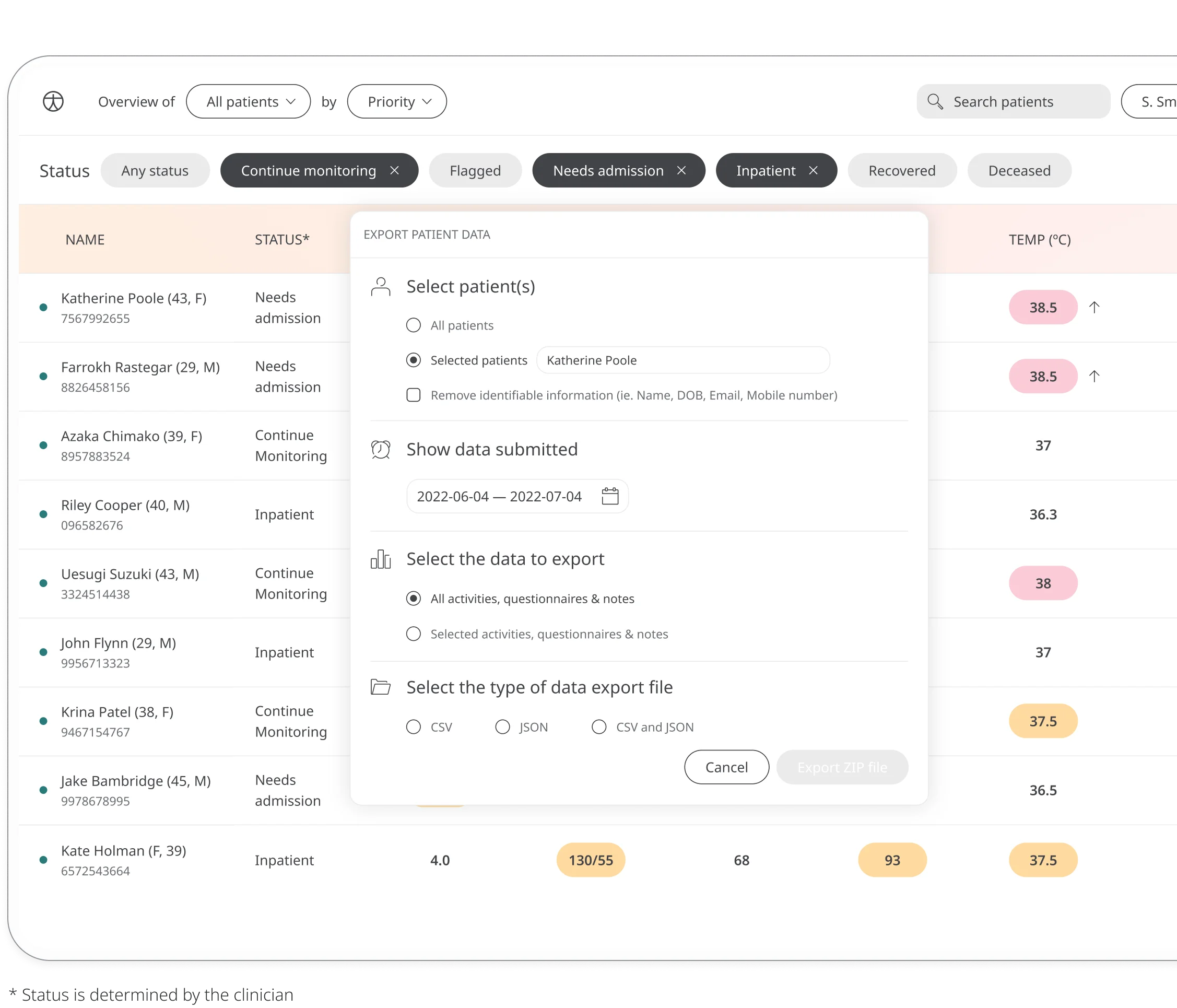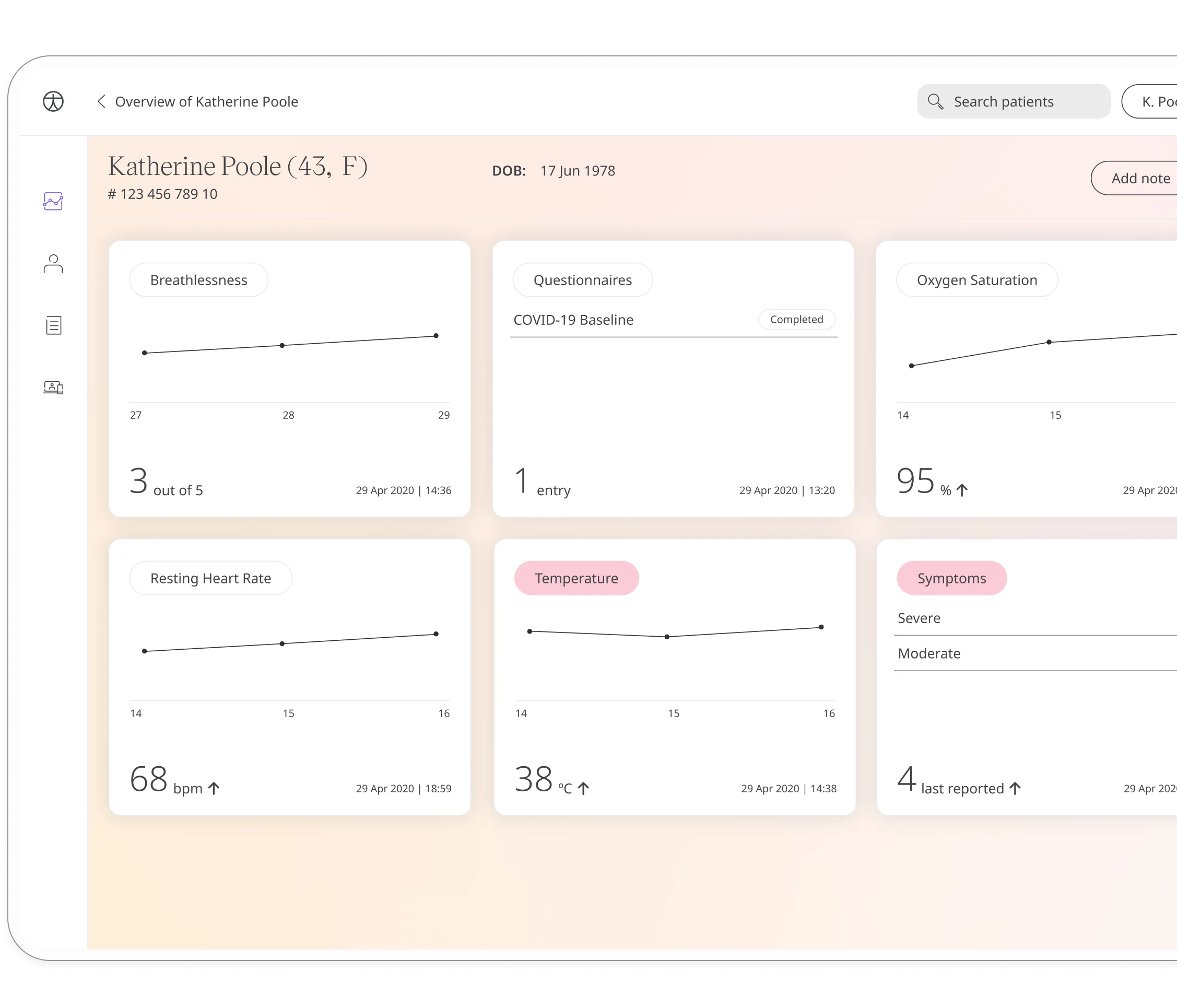 Clinicians can manage multiple patients within a web-based portal. The technology can use a clinician-determined threshold to flag patients who might need prioritising, based on the data submitted by patients through the app.