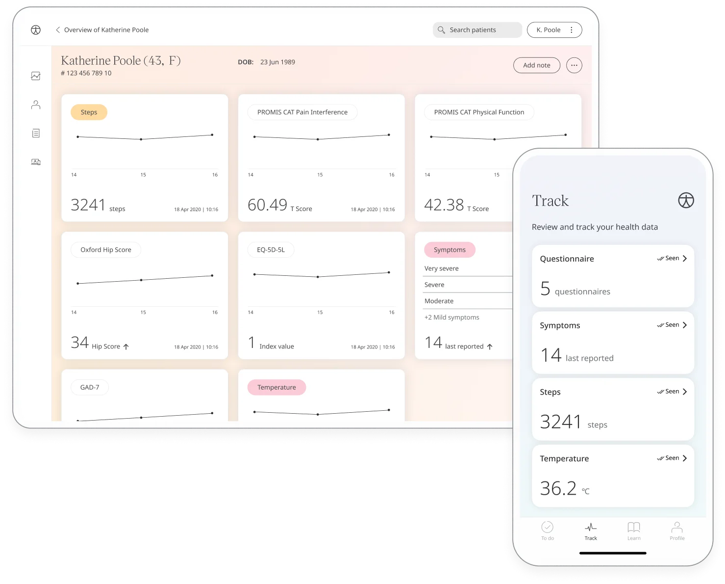 Our 'hospital at home' supports perioperative care. Educational content, questionnaires, symptom and activity tracking and telemedicine help prepare patients. Remote monitoring aids rehabilitation and aggregated, anonymised data drives clinical advances.