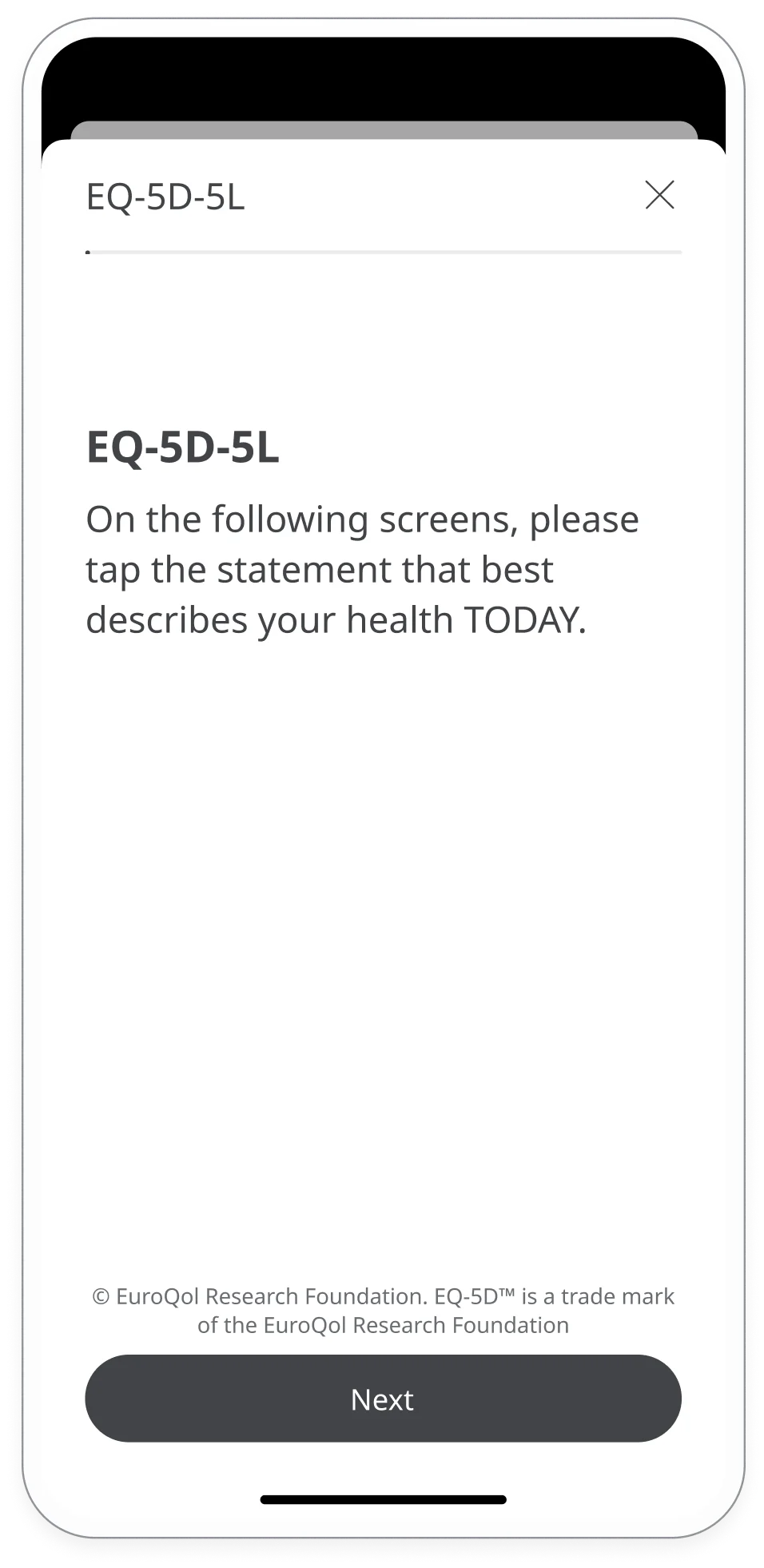 The app provides validated clinical questionnaires, for example the Oxford Knee Score, EQ-5D, Global Health Score and Promis CAT.